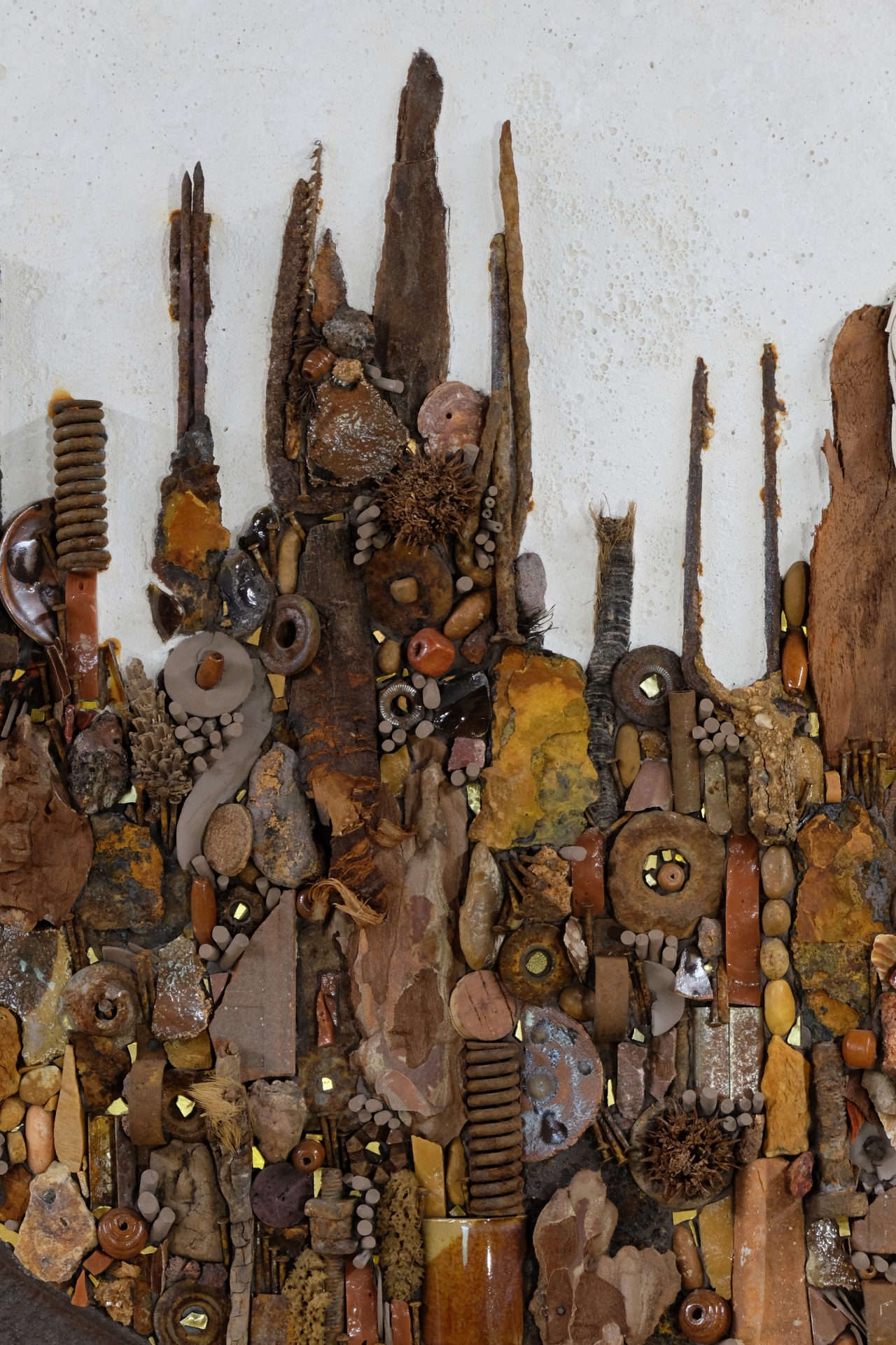 Avec Second souffle, l’artiste nous invite à pénétrer un univers où la mosaïque devient un langage entre matière et mémoire. Par un subtil jeu d’associations entre matériaux nobles et fragments du quotidien — céramiques brisées, papiers usés, bois flottés, métaux rouillés, bijoux oubliés ou objets intimes — elle compose des œuvres empreintes de sensibilité et de résonances. Chaque pièce incarne une renaissance, un « second souffle » offert à la matière.